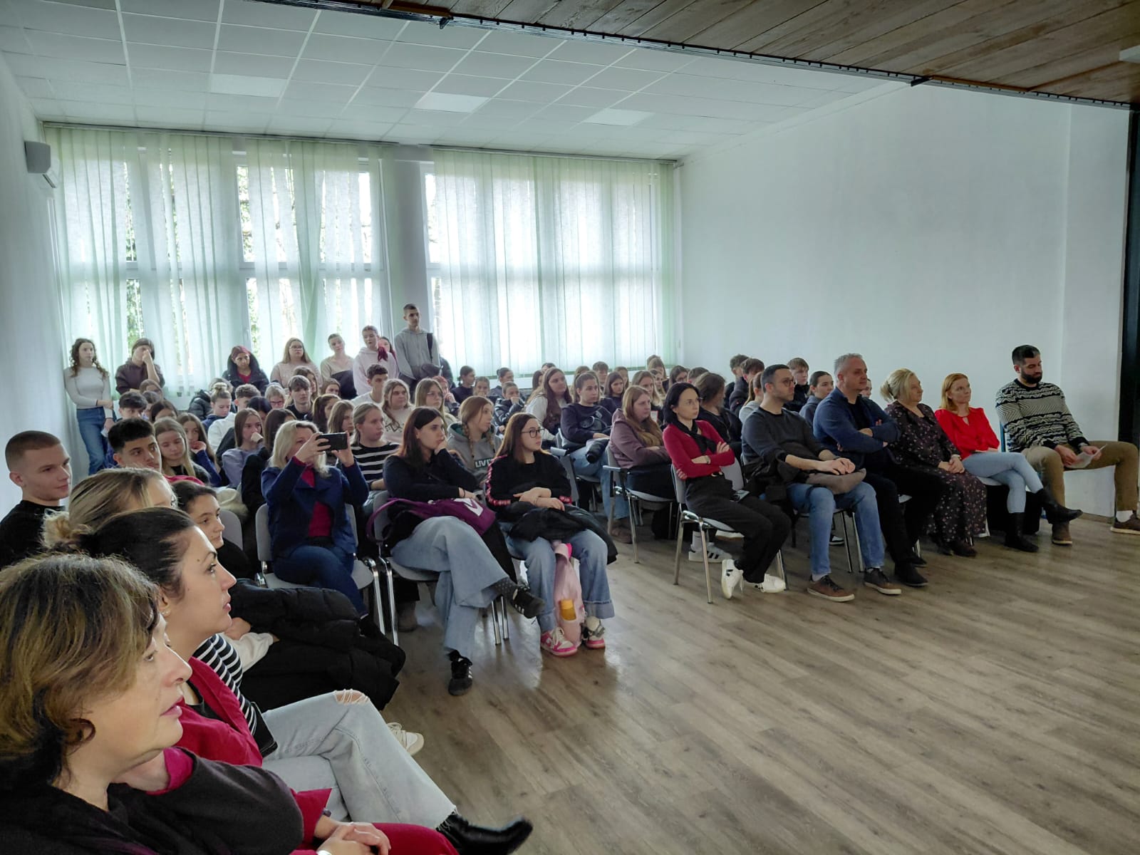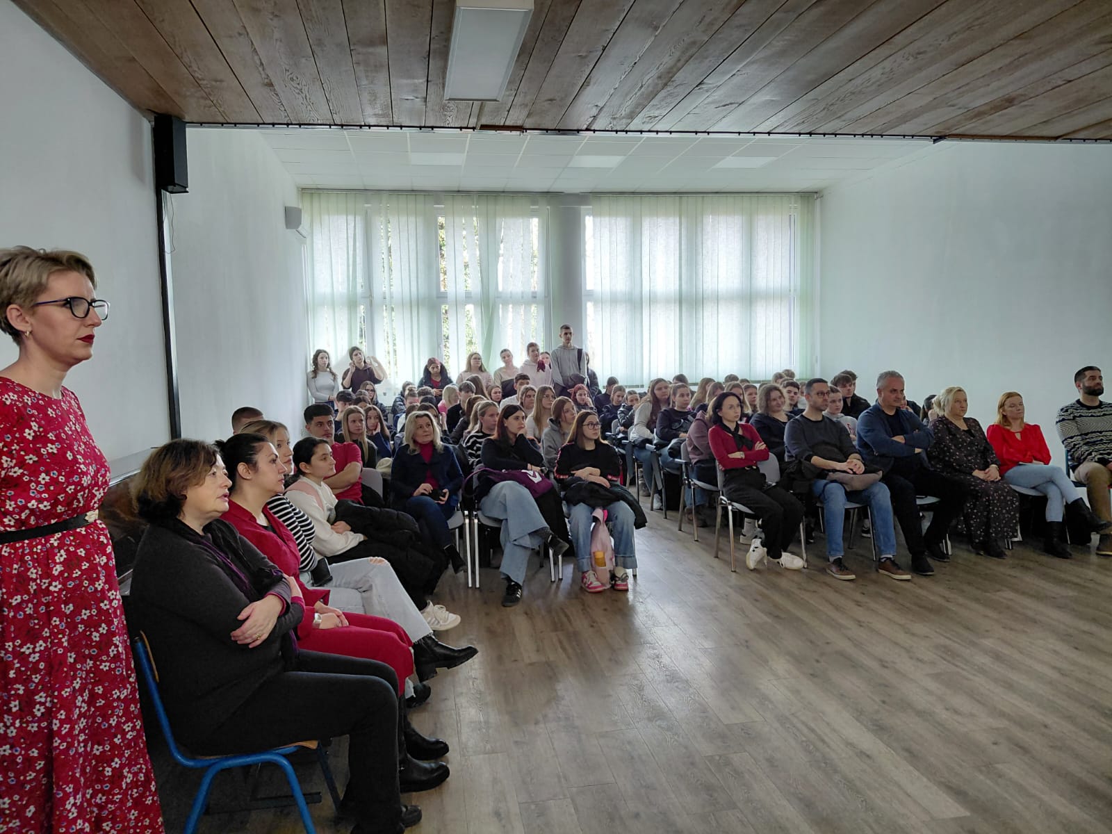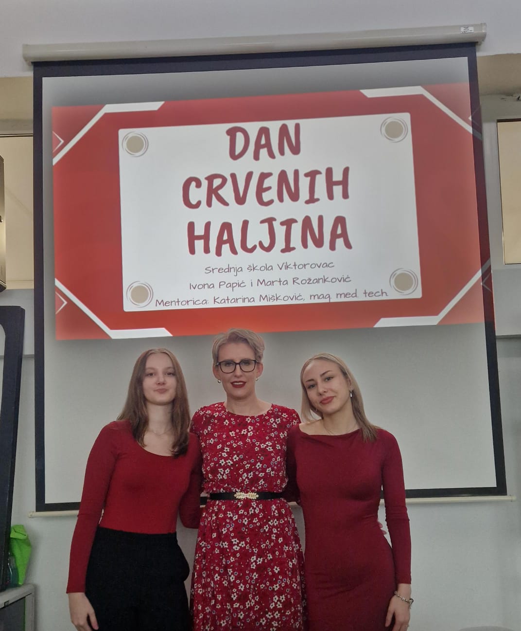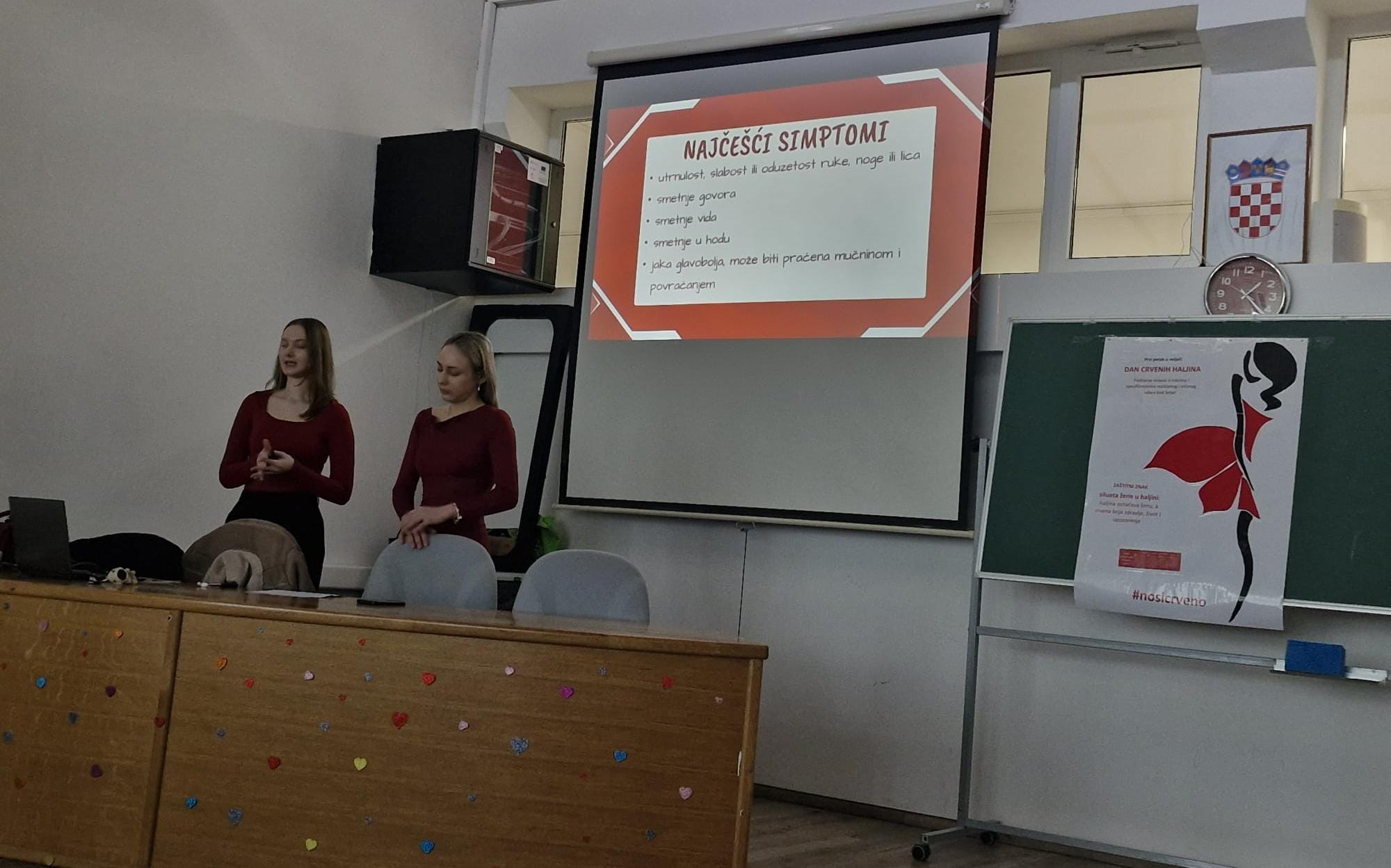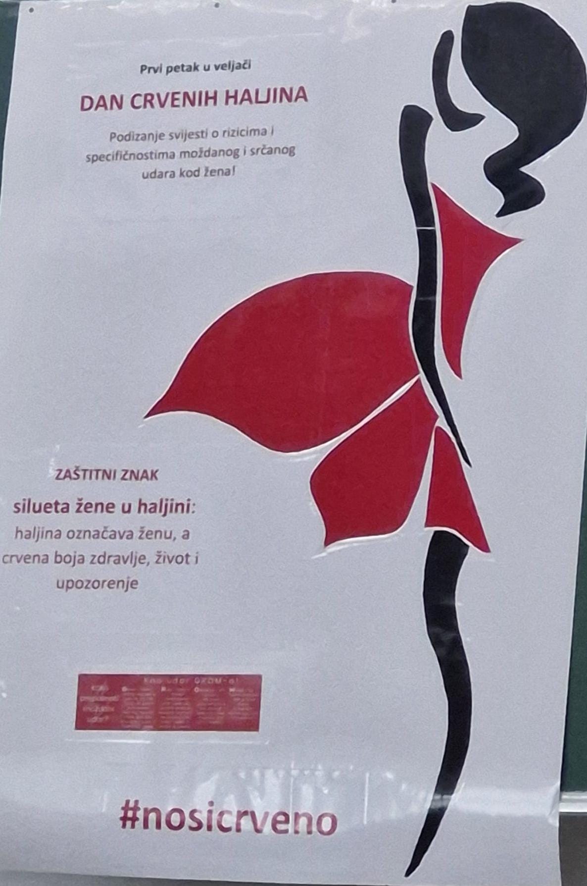 Učenici 4.f1 razreda Ivona Papić i Marta Rožanković, zajedno sa strukovnom nastavnicom zdravstvene njege Katarinom Mišković, obilježili su Dan crvenih haljina te su upoznali profesore i učenike Srednje škole Viktorovac o specifičnostima moždanog udara kod žena.